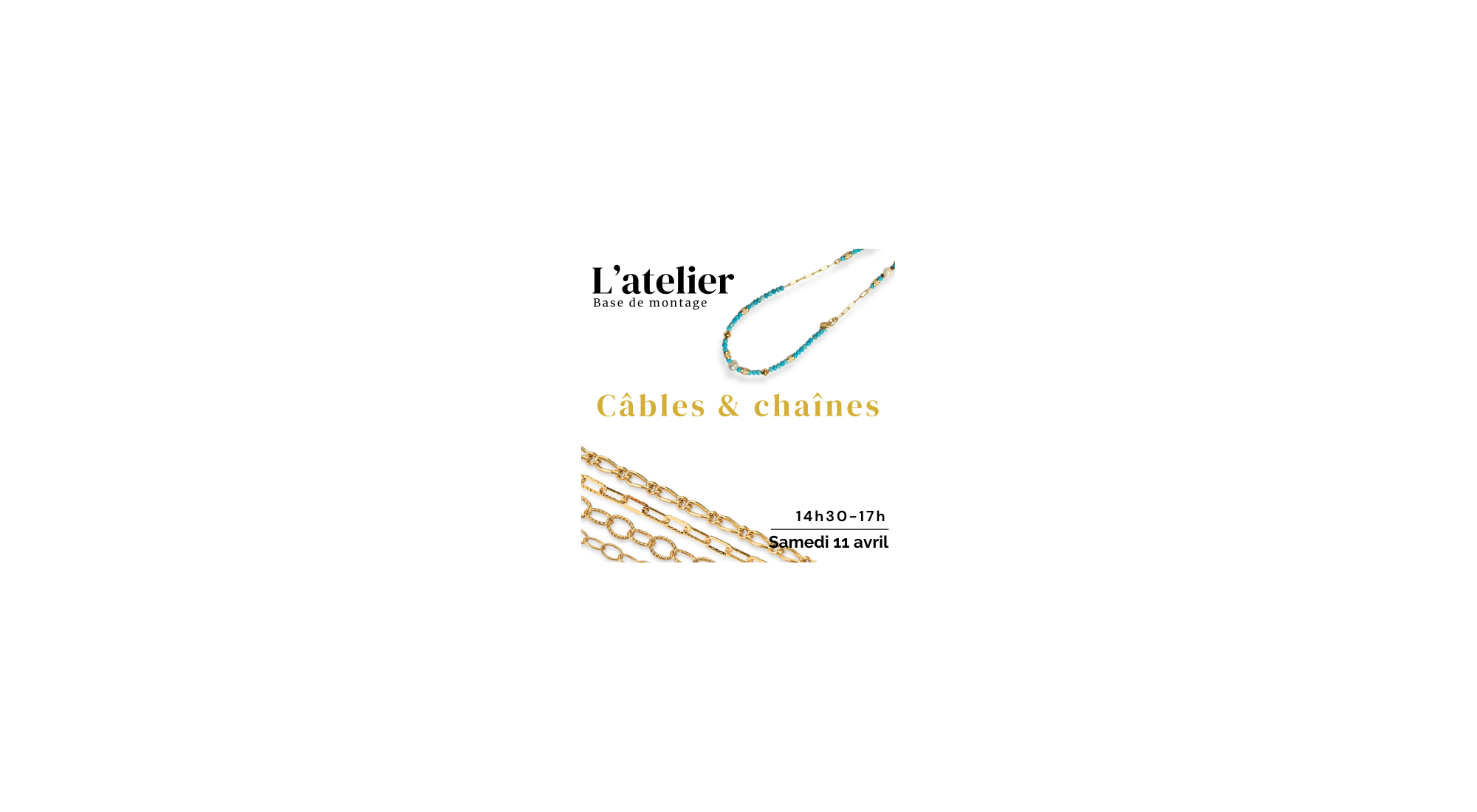 - Matériaux : apprêts premium (plaqué argent / dorure à l’or fin 999 ‰), perles sélectionnées et outils mis à disposition gracieusement
